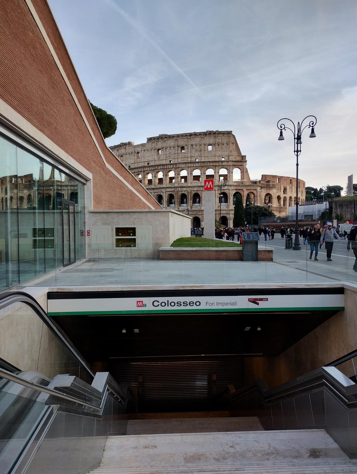 In primo piano l'entrata della stazione della metropolitana "Colosseo fori imperiali", con scala al centro e scale mobili ai due lati, l'insegna piΓΉ un lΓ e sullo sfondo il Colosseo
