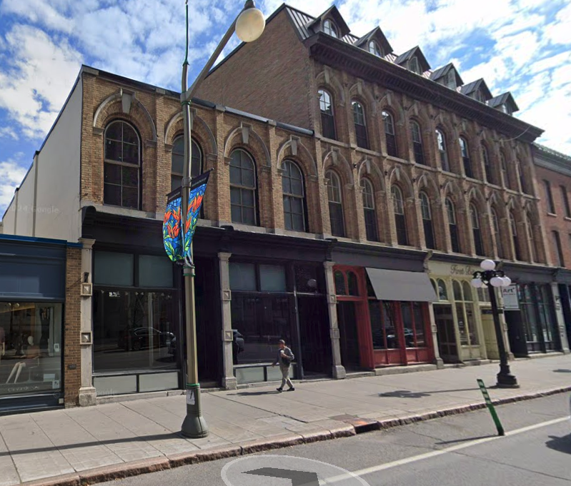 A brick street-level late 19th century storefront with lots of character. It's two stories, with a 3 storey-dormered section next door.