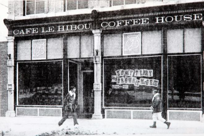 An old grainy photo shows the front of the Coffeehouse in the late 60s, maybe 1970. The signs in the window indicate that famed Americana folk and blues performers Sonny Terry and Brownie McGee were playing there at the time.
