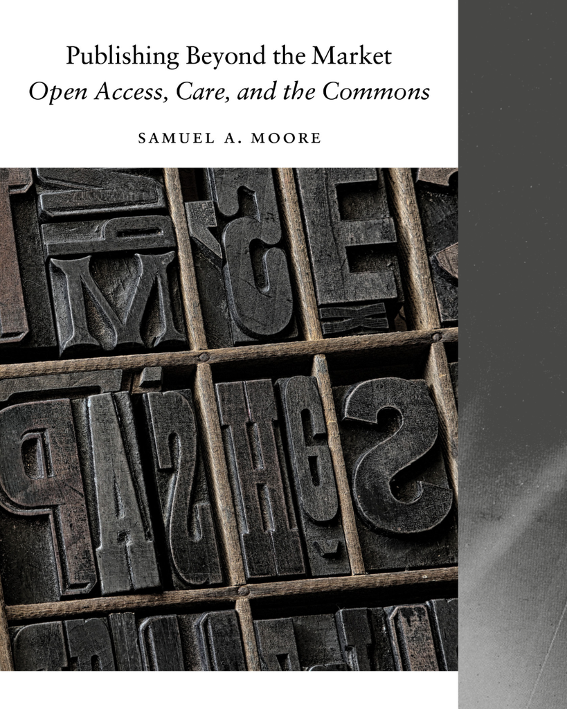 Book cover for "Publishing Beyond the Market: Open Access, Care, and the Commons" by Samuel A. Moore, featuring vintage printing blocks arranged in a drawer.