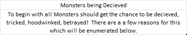 Monsters being Decieved To begin with all Monsters should get the chance to be decieved, tricked, hoodwinked, betrayed! There are a a few reasons for this which will be enumerated below.