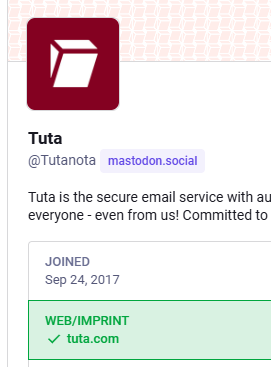 Cropped screenshot of Tutanota's profile as viewed from mastodon.social. It is clearly verified.