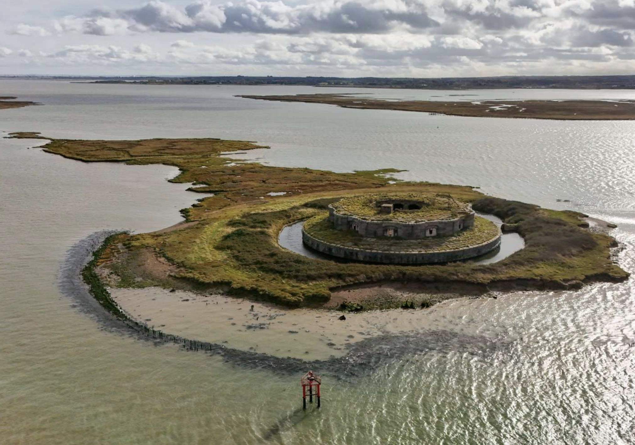 A photo of an old sea fort out on the water, covered by green growth and surrounded by patches of green land.