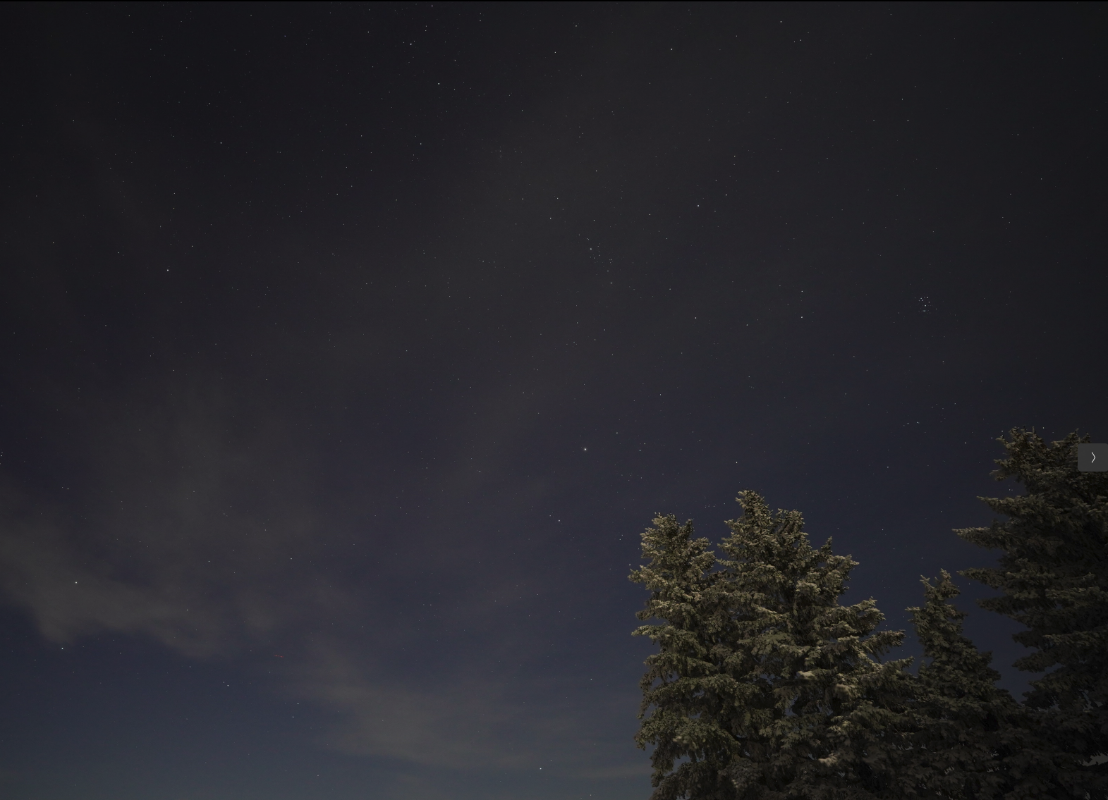 A nighttime scene showing some frosty spruce trees and stars mostly obscured by high clouds.