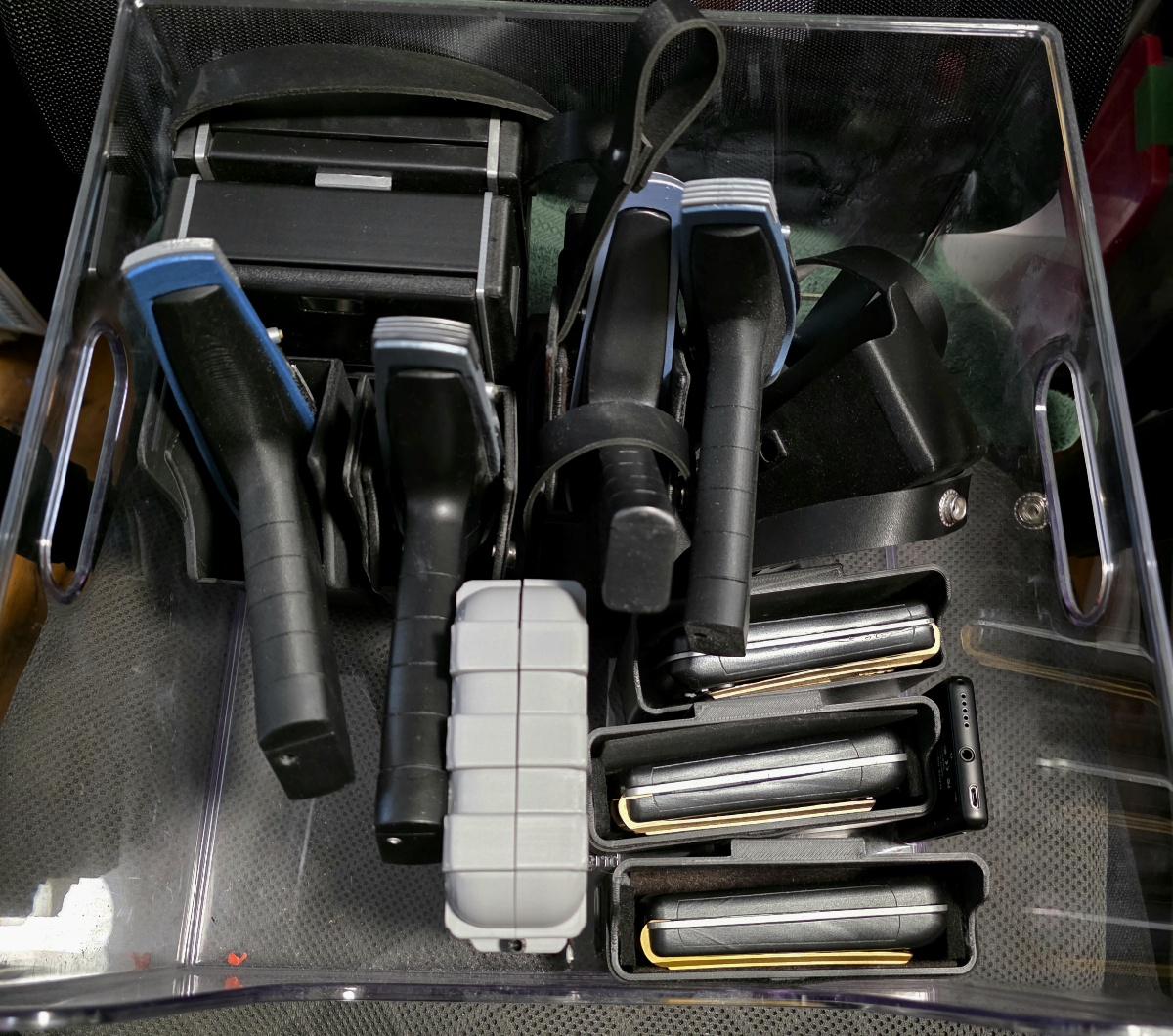 A bin full of Star Trek Strange New worlds props. Four phasers, two tricorders, and four communicators (One is in a grey case)