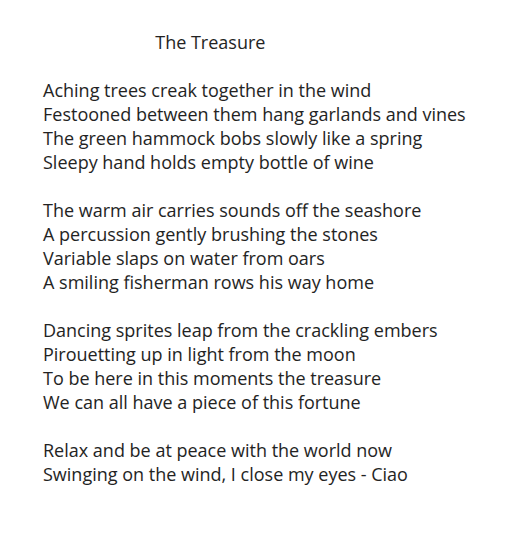 A poem in the style of a sonnet, that I have called: The Treasure, inspired by the mastoprompt for the 10th October 2025, Variable Aching trees creak together in the wind Festooned between them hang garlands and vines The green hammock bobs slowly like a spring Sleepy hand holds empty bottle of wine The warm air carries sounds off the seashore A percussion gently brushing the stones Variable slaps on water from oars A smiling fisherman rows his way home Dancing sprites leap from the crackling embers Pirouetting up in light from the moon To be here in this moments the treasure We can all have a piece of this fortune Relax and be at peace with the world now Swinging on the wind, I close my eyes - Ciao
