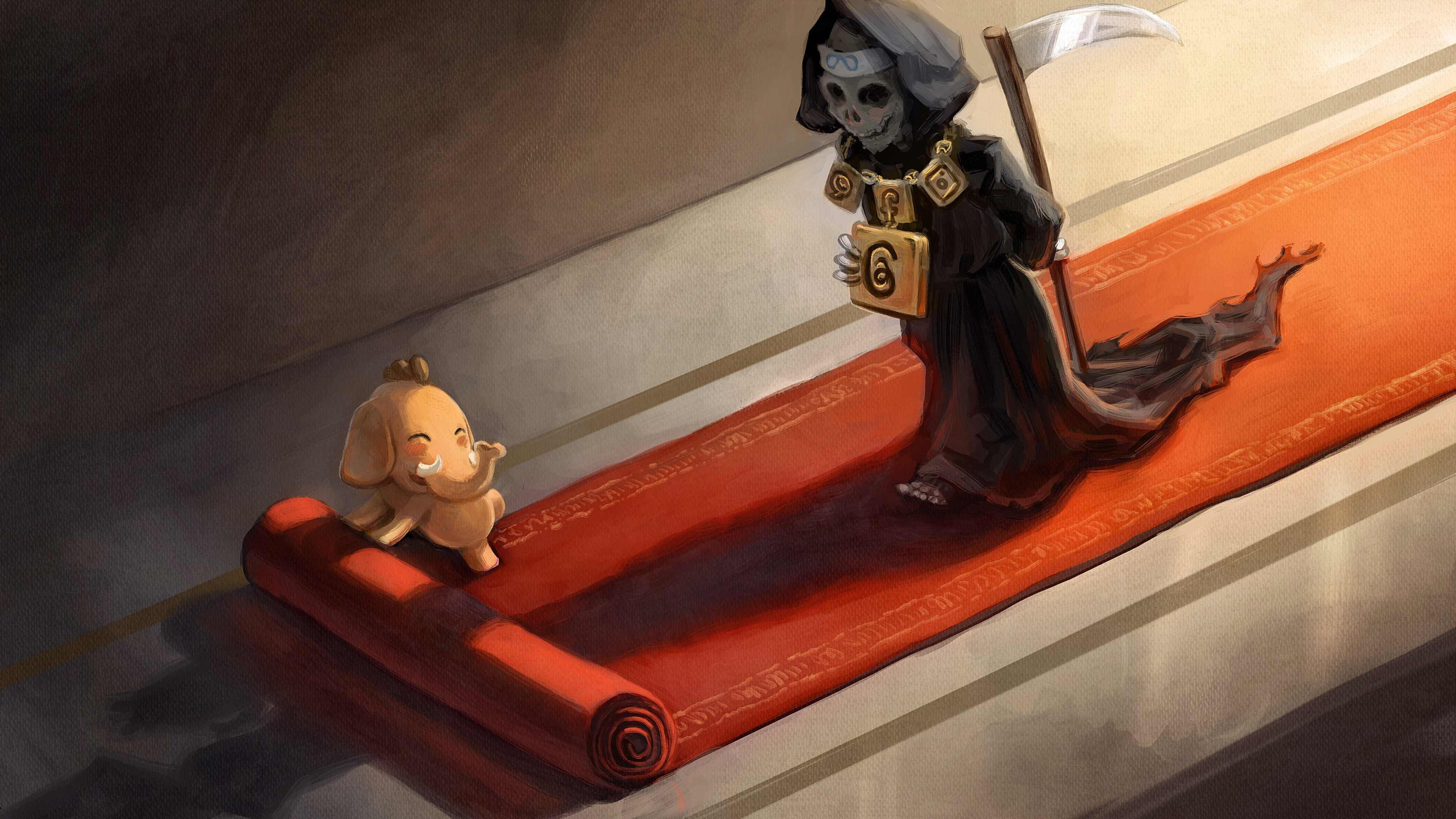 Disegno digitale della mascot di Mastodon, un elefantino arancione, che srotola un tappeto rosso al passaggio di una figura con il mantello nero e la falce nascosta dietro la schiena: รจ la rappresentazione dell'azienda Meta, identificata con una fascia sulla testa che ne riporta il logo, assieme ad una collana dorata con appesi i logo di Whatsapp-Facebook-Instagram e portato avanti con la mano quello di Threads. "Don t roll out the red carpet for them" by David Revoy, with mascots of Mastodon and with fair-use of Meta's logos. โ CC-BY 4.0