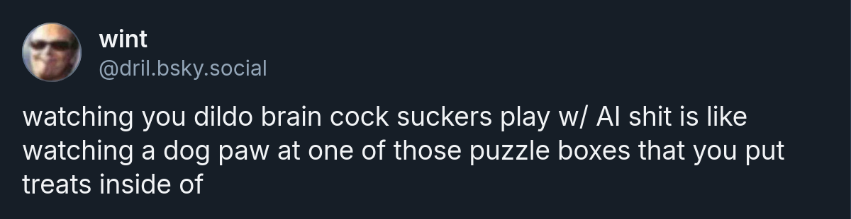 bluesky post from wint (βͺ@dril.bsky.socialβ¬): watching you dildo brain cock suckers play w/ AI shit is like watching a dog paw at one of those puzzle boxes that you put treats inside of