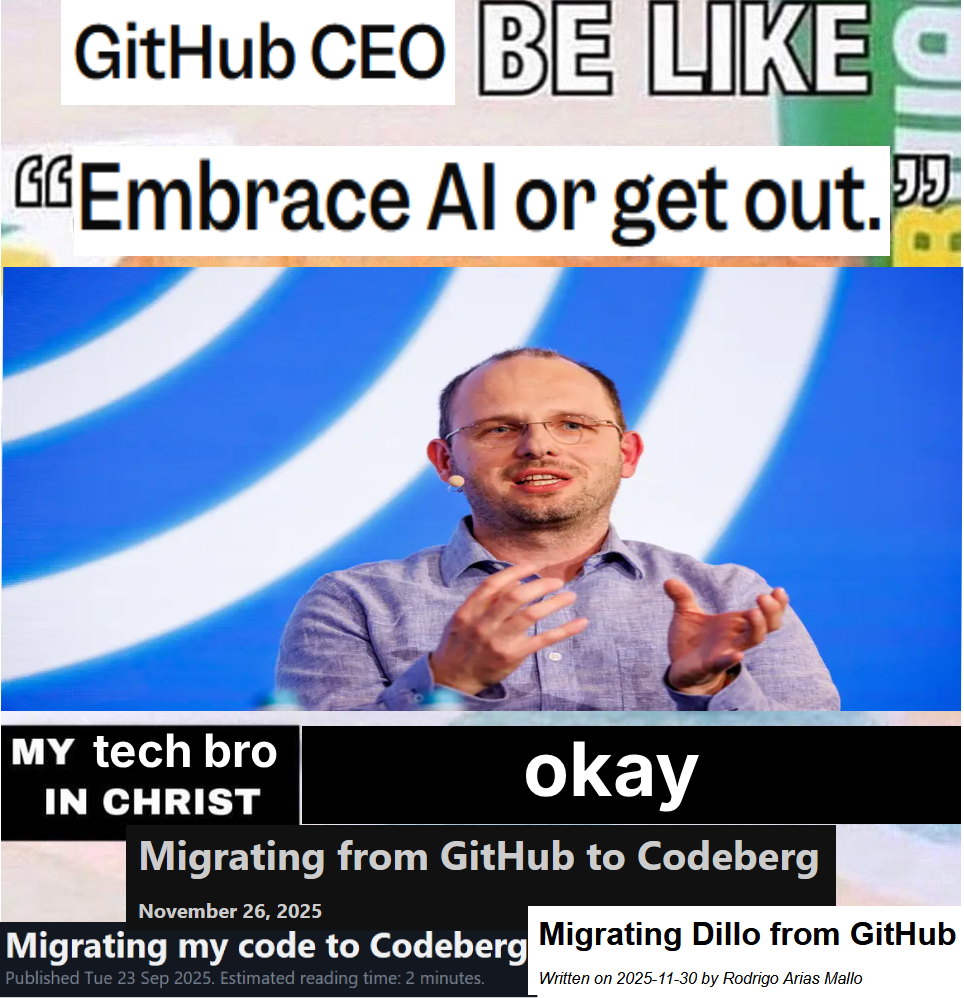 the subway "you made the sandwich" meme, edited to read: github ceo be like: "embrace ai or get out." my tech bro in christ, okay followed by screenshots of several projects' blog posts about migrating away from github