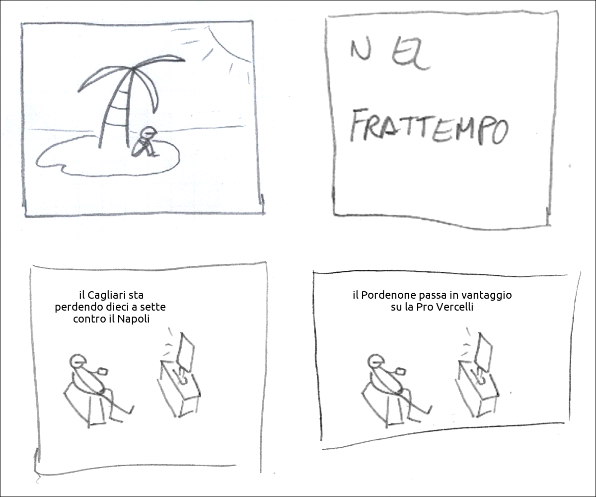 c'è un tizio su un'isola deserta didascalia: nel frattempo la TV fa: «il Cagliari sta perdendo dieci a sette contro il Napoli» la TV fa: «il Pordenone passa in vantaggio su la Pro Vercelli»