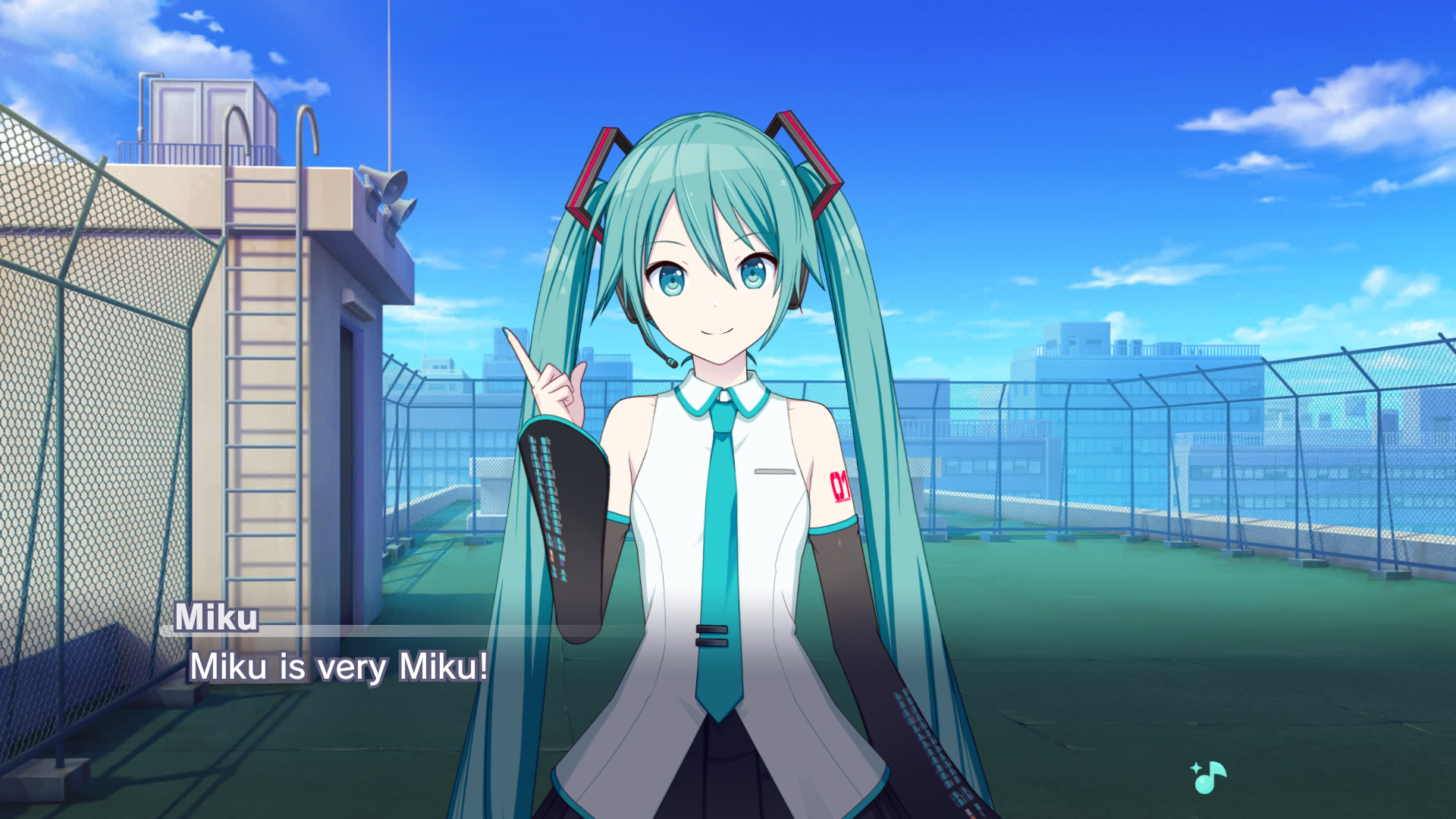 Made from Project Sekai's story board, on a rooftop, Hatsune Miku says "Miku is very Miku!"