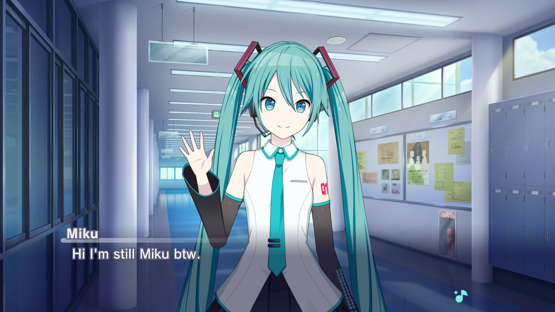 Made from Project Sekai's story board, in a school hallway, Hatsune Miku says "Hi I'm still Miku btw."