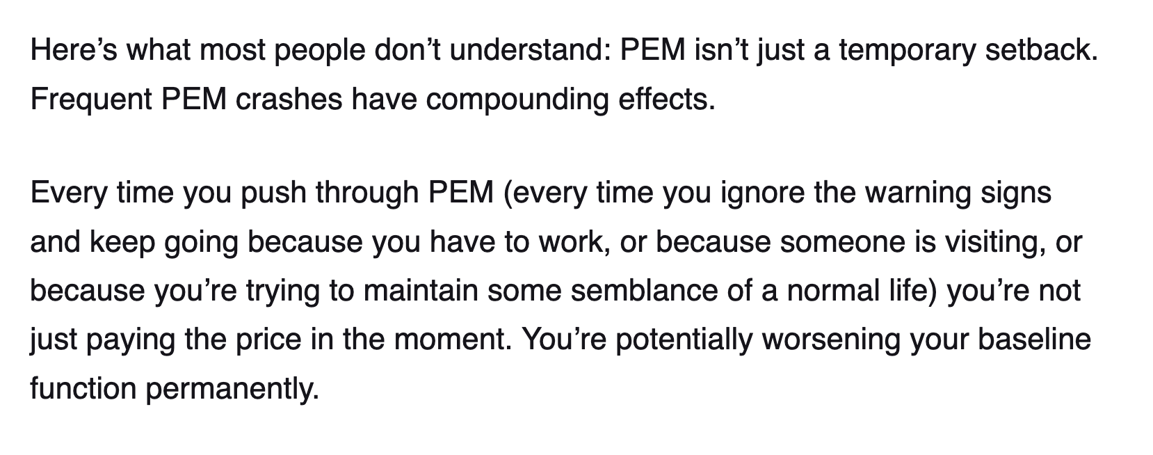 Hereโs what most people donโt understand: PEM isnโt just a temporary setback. Frequent PEM crashes have compounding effects. Every time you push through PEM (every time you ignore the warning signs and keep going because you have to work, or because someone is visiting, or because youโre trying to maintain some semblance of a normal life) youโre not just paying the price in the moment. Youโre potentially worsening your baseline function permanently.