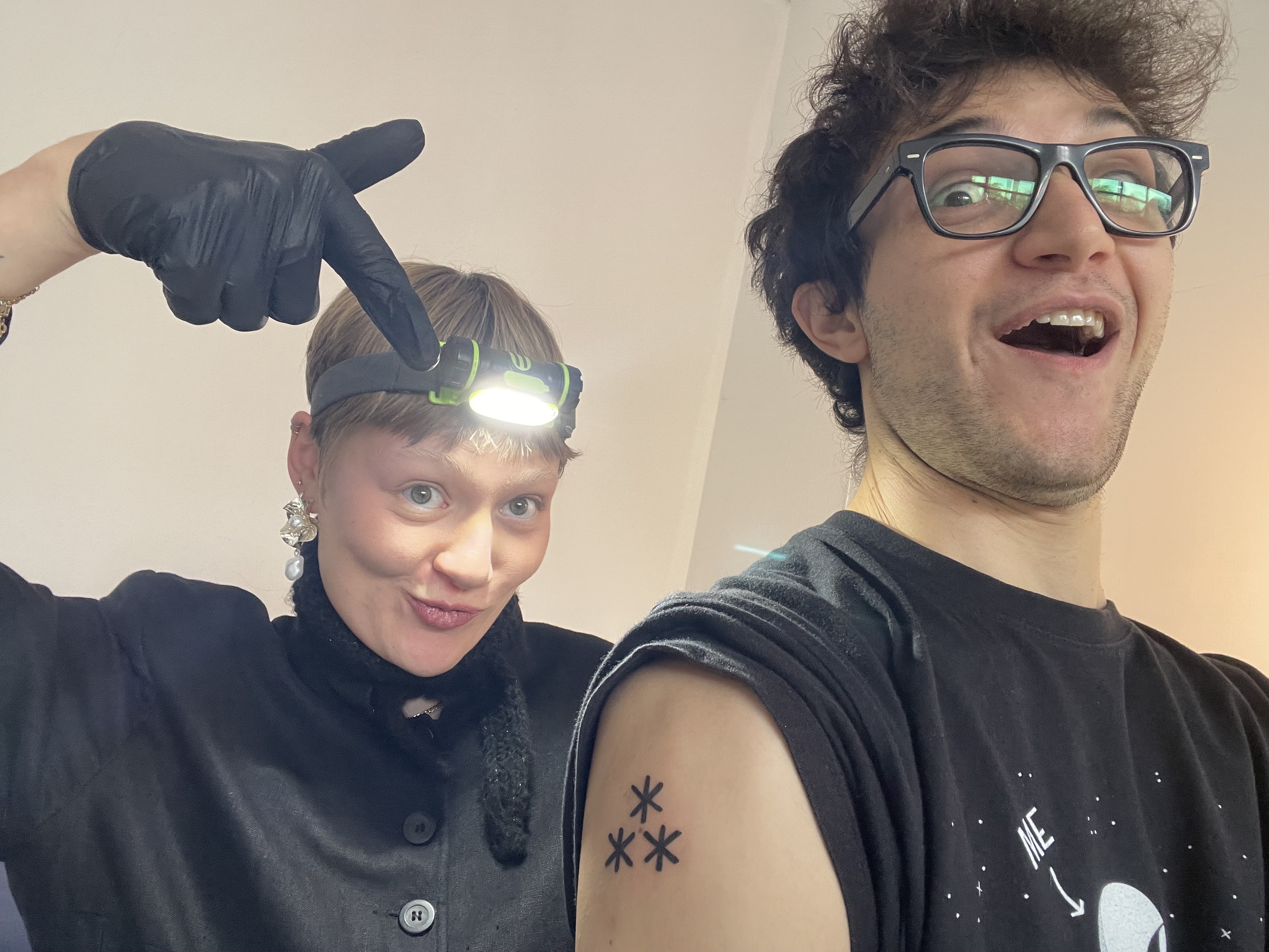 Selfie of Feine with tattooing gloves and a headlamp + me with the asterism just tattooed on my shoulder