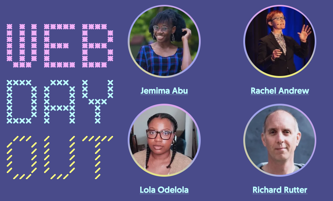 A screengrab of the Web Day Out website showing the logo and four of the speakers: Jemima Abu, Rachel Andrew, Lola Odelola, and Richard Rutter.