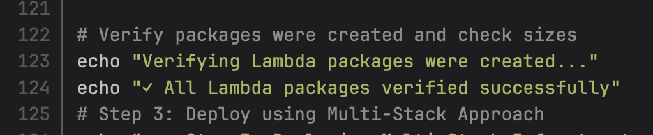 A screenshot of a code editor. The line numbers are in the lefthand column, running from 121 to 125. There is a comment that says "Verify packages were created and check sizes" Then line 123 says echo Verifying Lambda packages were created... and Line 124 says echo checkmark emoji colon All Lambda packages verified successfully. There is no line in here that actually did anything.