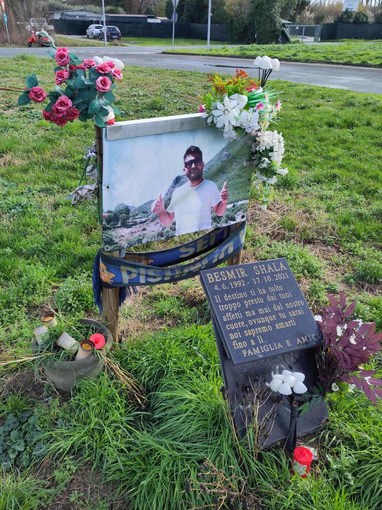 Sacrario stradale dedicato a Besmir Shala, morto nel 2021. il sacrario รจ composto di una sua foto con i pollici alzati decorata da fiori e una sciarpa del Pisa. La targa, nera con scritte d'oro, riporta nome, nascita, morte e l'affetto dei suoi cari.