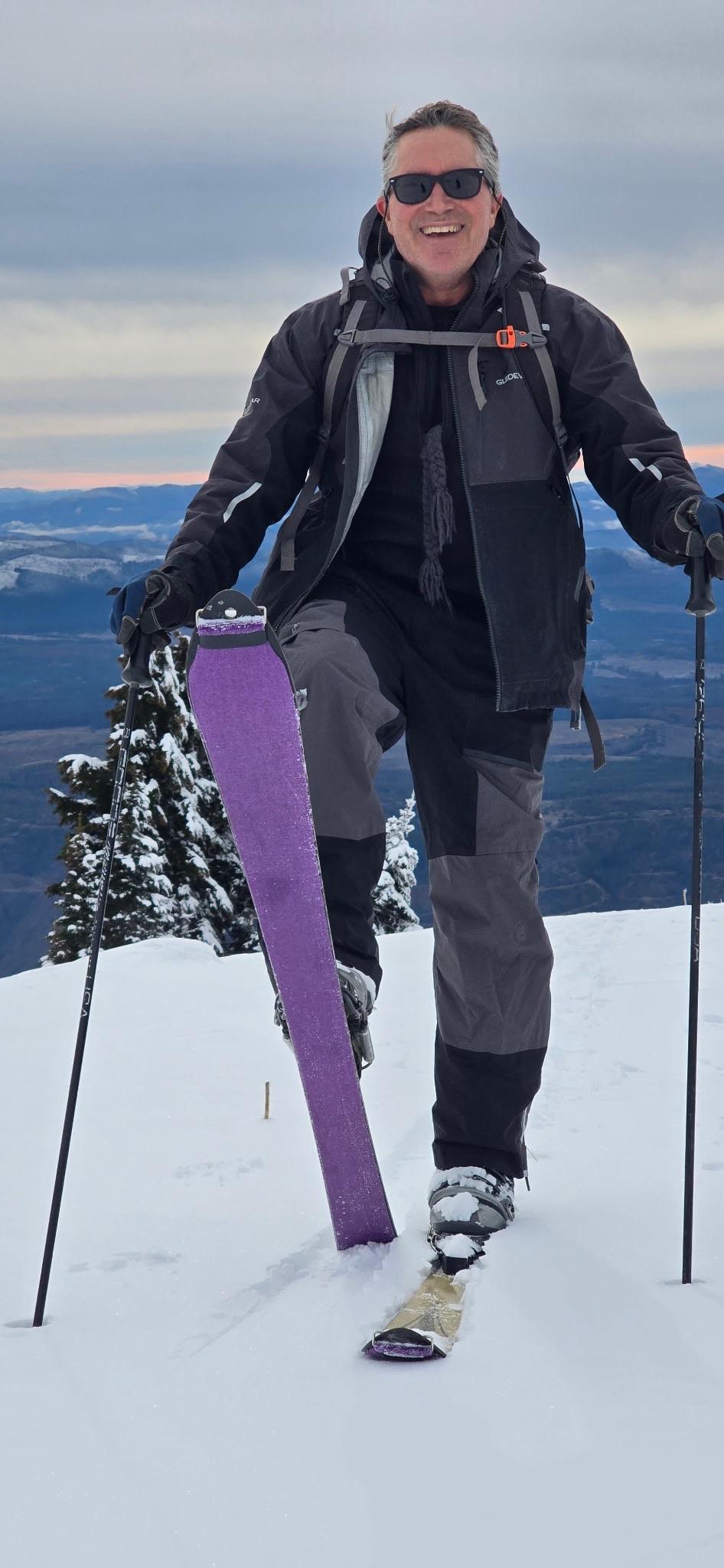 A person is standing on a snowy slope, wearing sunglasses and winter sports gear. They are holding a ski pole and have a purple ski on one foot. The background features distant mountains and a cloudy sky, indicating a mountainous landscape.