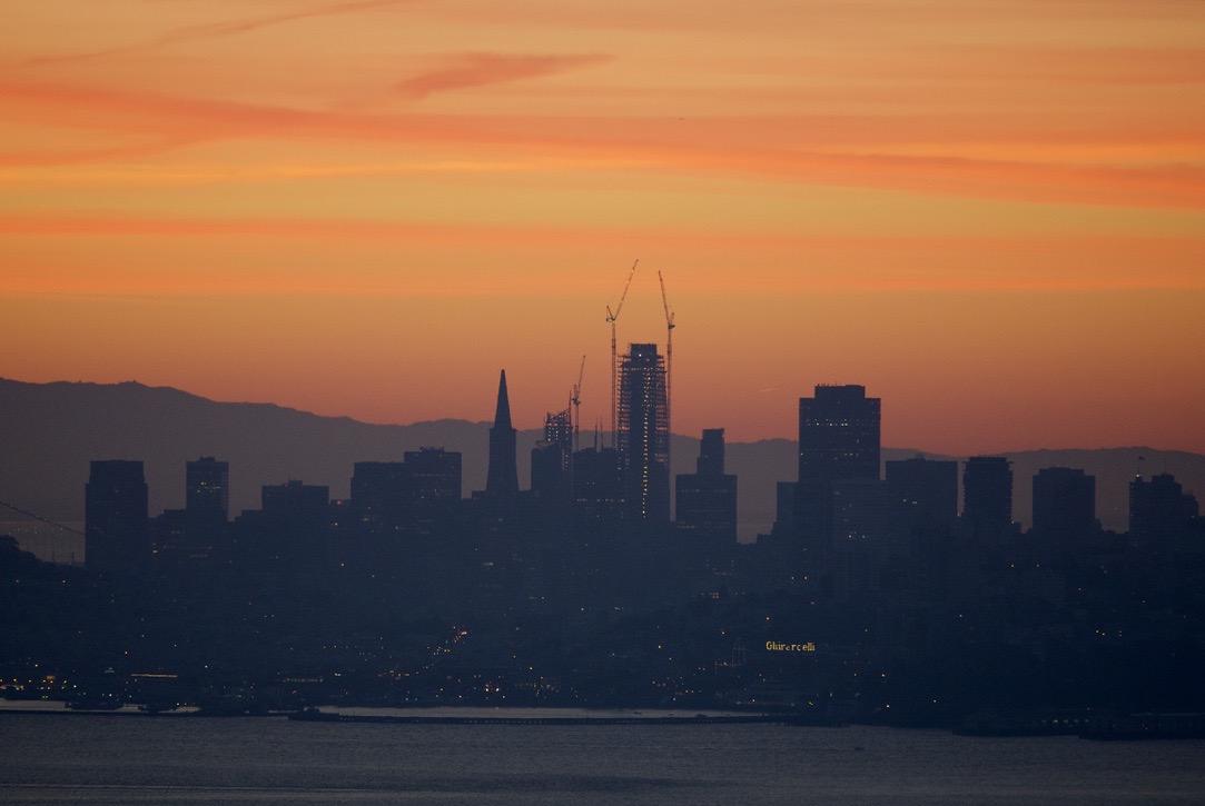 Photograph of sunset over San Francisco in late January, 2017. The sky is layers of subdued orange clouds through which blue-ish lines of sky are visible. The SalesForce building is the tallest in the skyline, but although the floors seem complete the walls are absent, giving it an almost skeletal appearance. There are two cranes to left and right of the structure, reaching skyward above it.