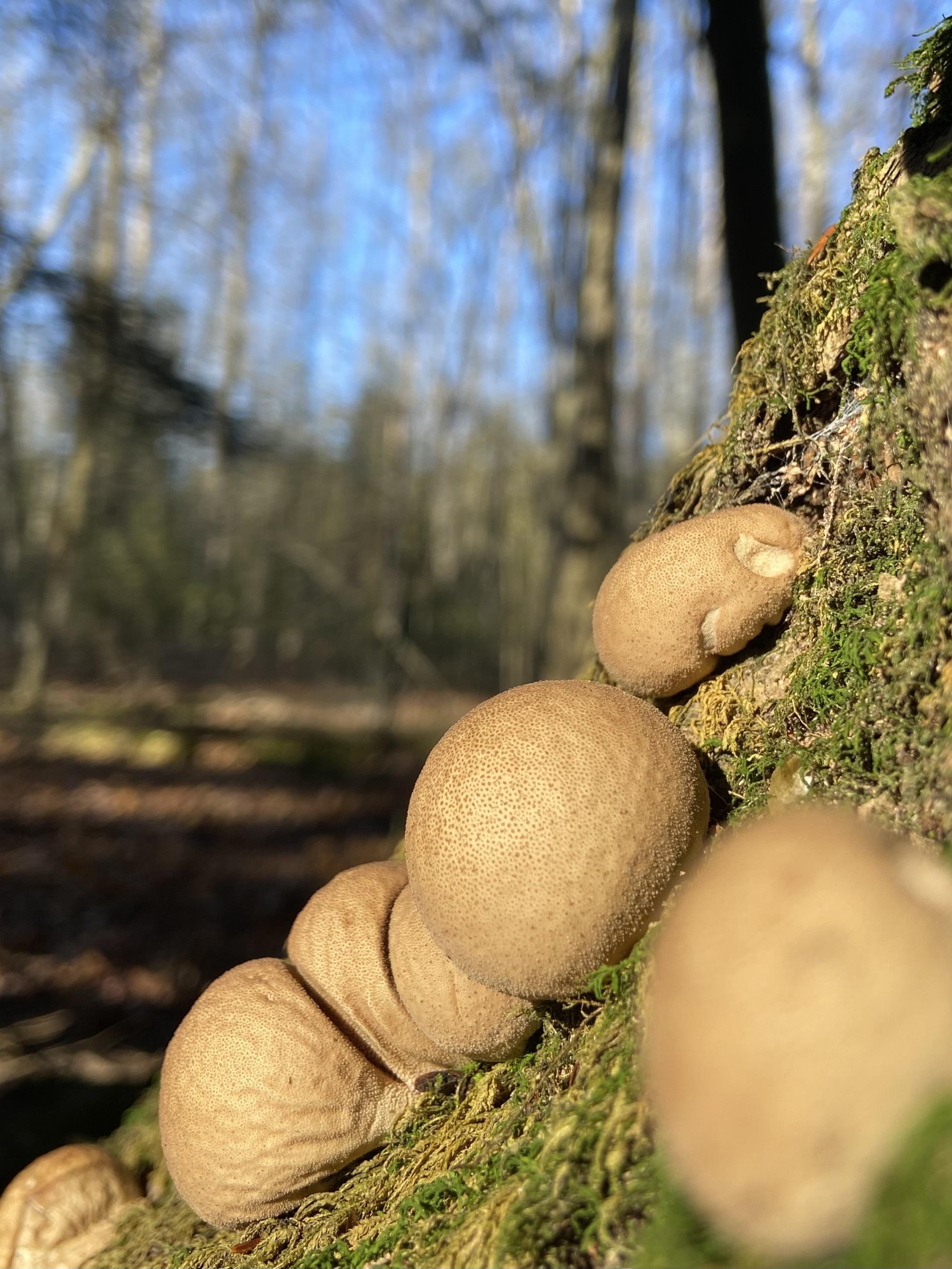A cluster of beige puffball mushrooms growing on a moss-covered tree trunk.
