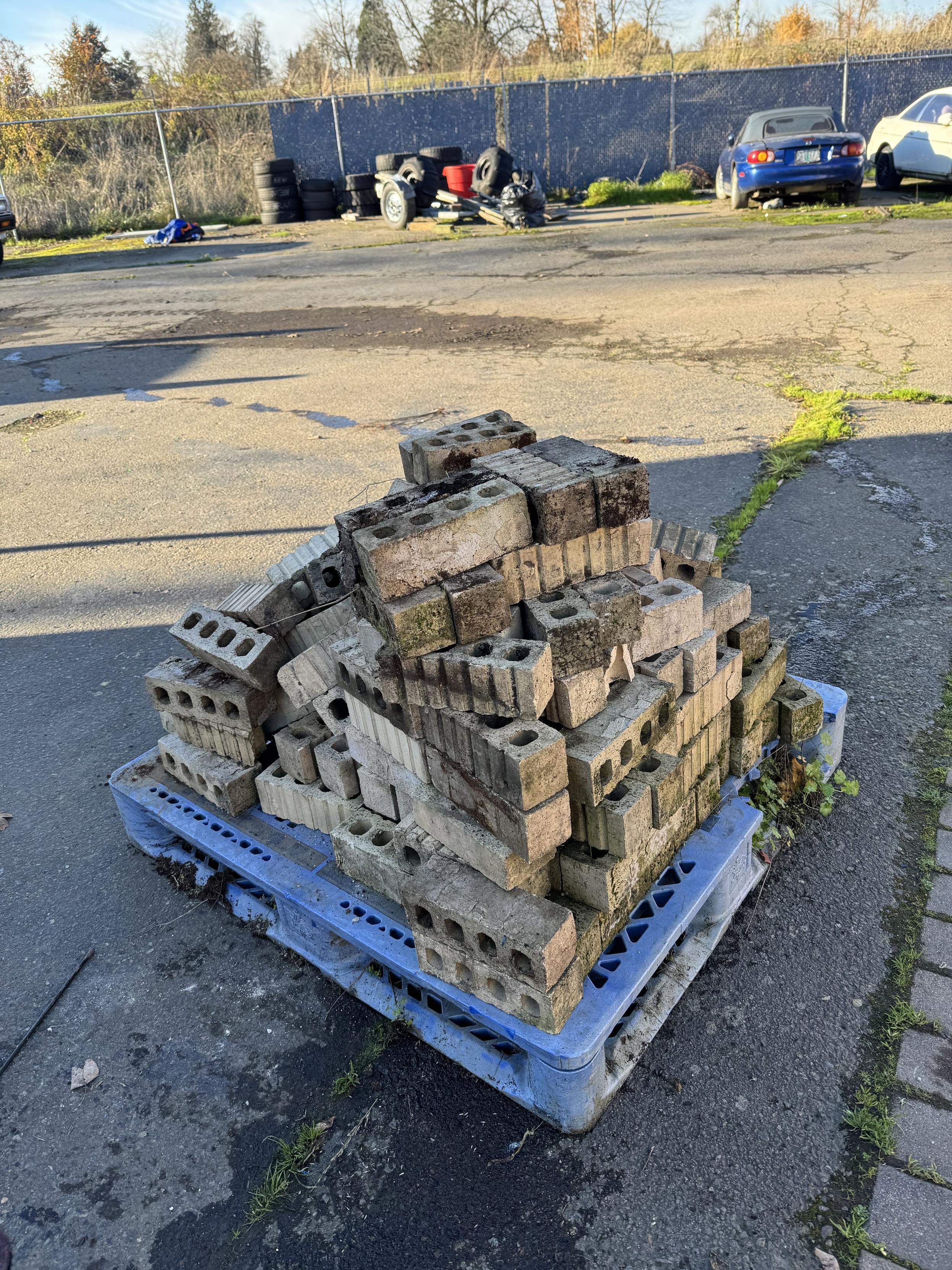 A stack of concrete blocks on a blue pallet, situated in an outdoor area with discarded tires and vehicles in the background.