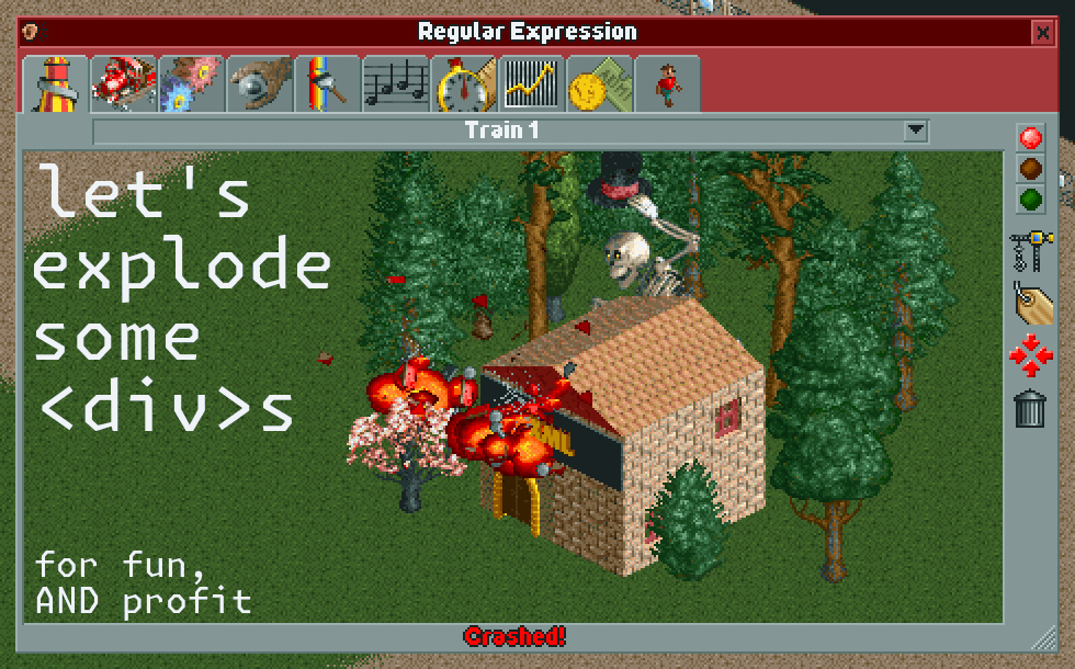 openrct2 screenshot. a train called "Regular Expression" explodes into a hut labelled "XML". of course there's a skelethor behind the hut