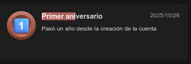 Image in spanish with a Achievement 'First Aniversary' and a date '2025/10/26 'A year has passed since the account was created.'