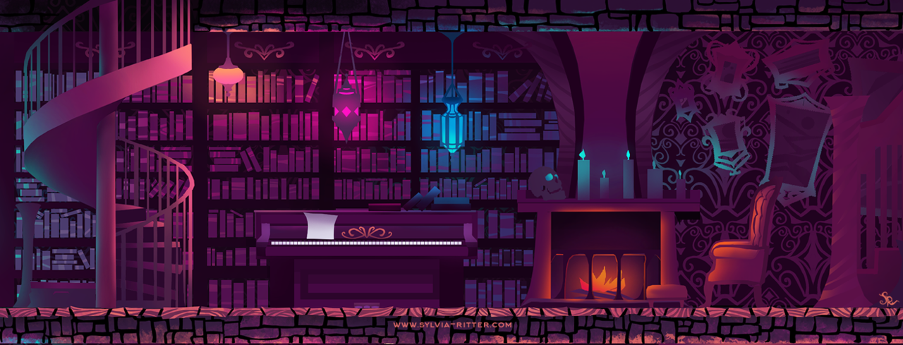 Created in March 2017 for an unannounced game. https://www.deviantart.com/sylviaritter/art/Evil-Library-Concept-Art-672550674 The spooky piano room with lots of books full of magic spells. A fireplace with a cozy armchair with pictures of ghostly landscapes on the wall. Candles and colorful lamps create a mysterious atmosphere.