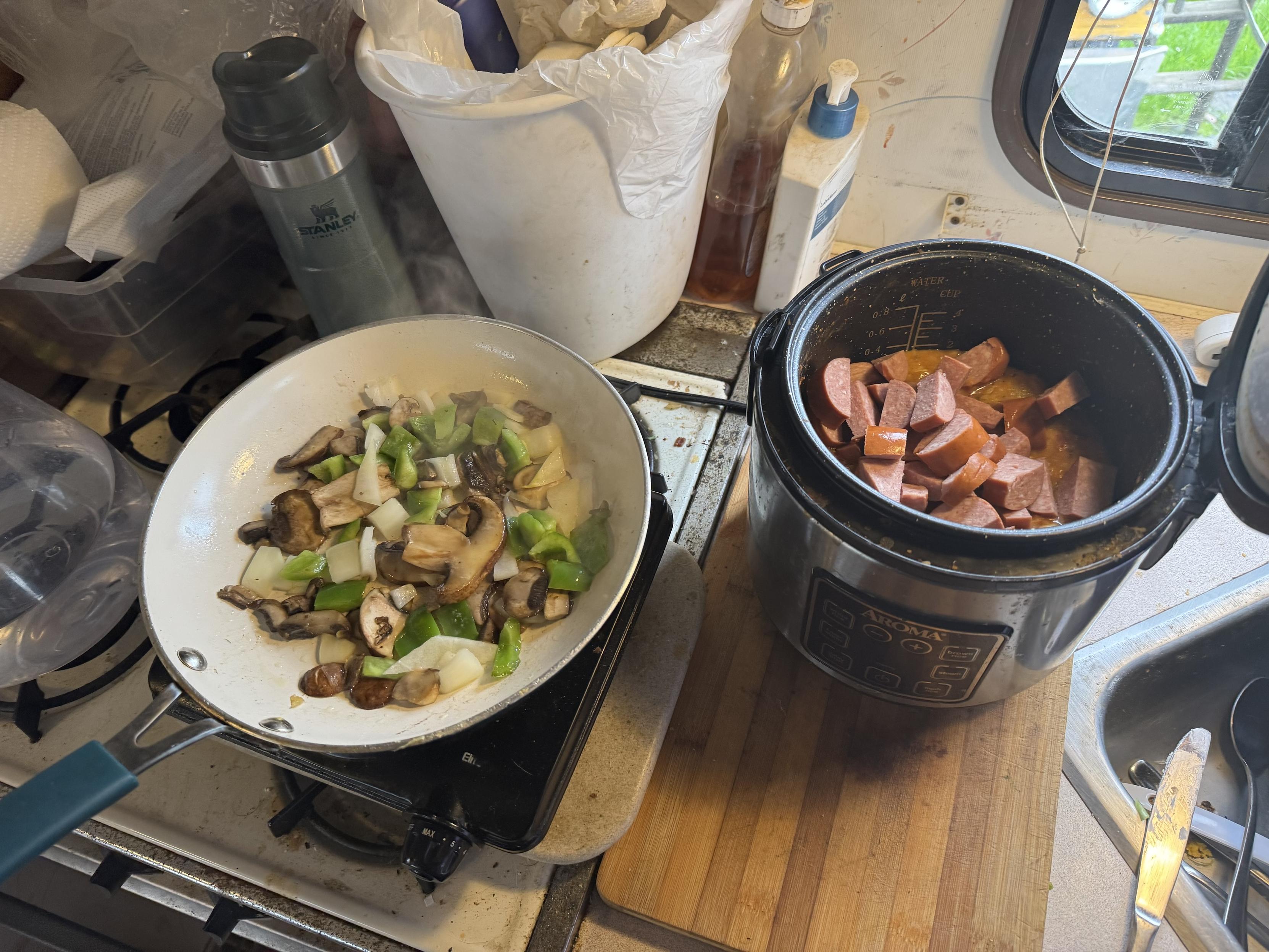 A pan on the stove with sautΓ©ing mushrooms, green peppers, and onions, next to a slow cooker containing sliced sausage. The countertop is cluttered with a thermos, bottles, and other kitchen items.