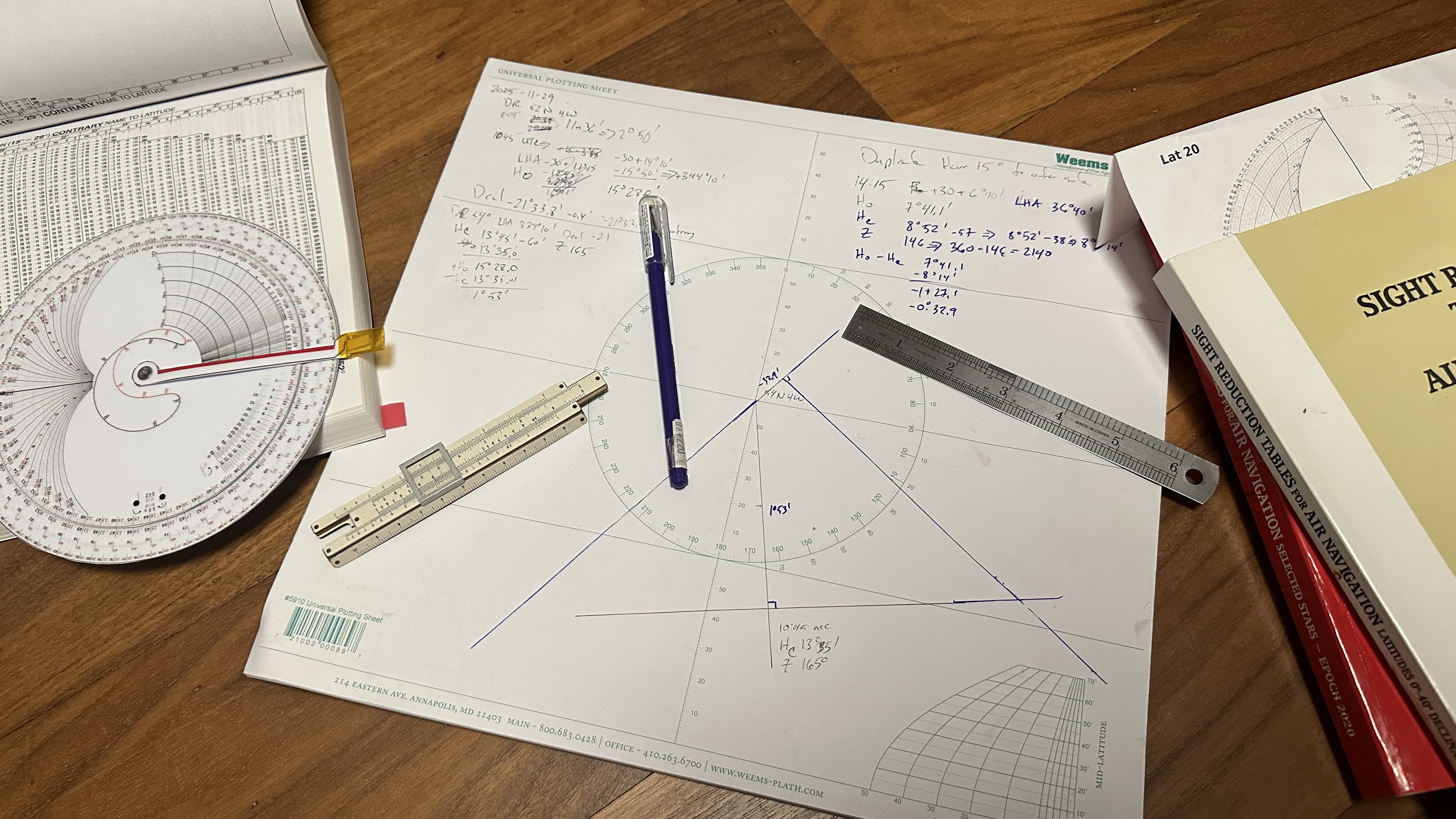 Sight reduction tables, plotting worksheet, normal slide rule and a custom one for degree math.