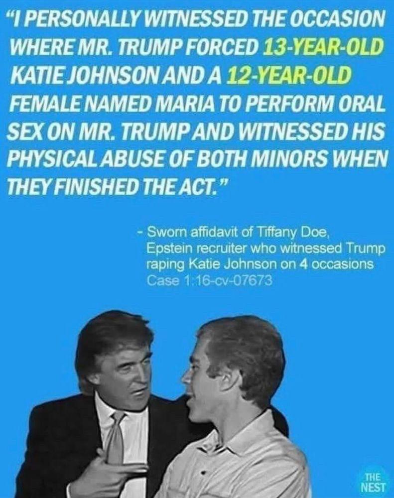 A photo of Trump/Epstein with the testimony of "Tiffiny Doe" who witnessed Trump's sexual abuse of Katie Johnson, 13 and Maria, 12.