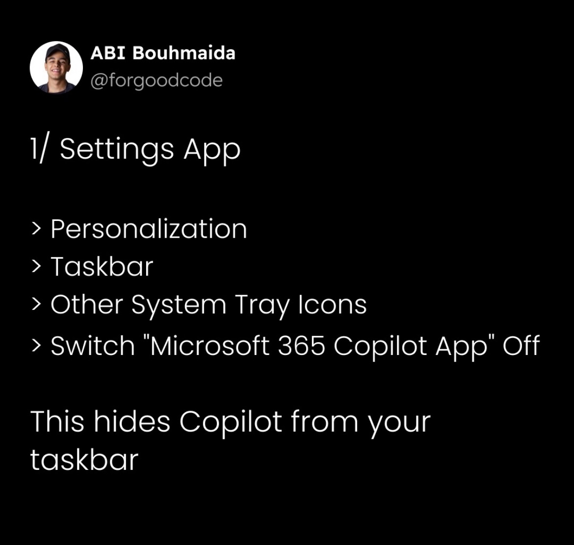 ABI Bouhmaida @forgoodcode 1/ Settings App > Personalization > Taskbar > Other System Tray Icons > Switch "Microsoft 365 Copilot App" Off This hides Copilot from your taskbar