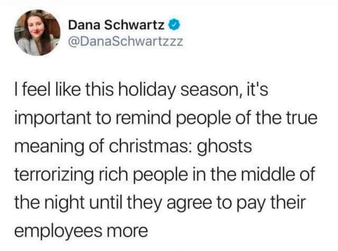 Social media post from Dana Schwartz (@DanaSchwartzzz): | feel like this holiday season, it's important to remind people of the true meaning of christmas: ghosts terrorizing rich people in the middle of the night until they agree to pay their employees more