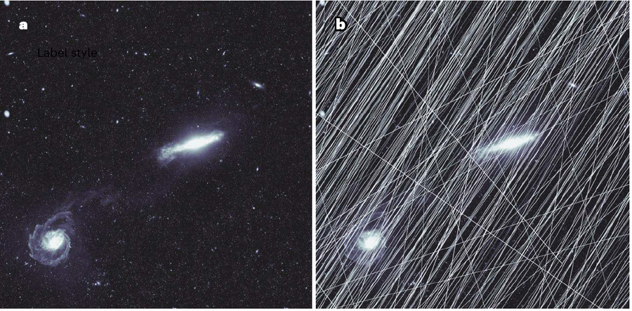 2 side-by-side images of a couple of galaxies, taken from a space-based telescope so the images are very sharp. The right image is covered by bright lines. It looks like a spiderweb on top of the two galaxies.