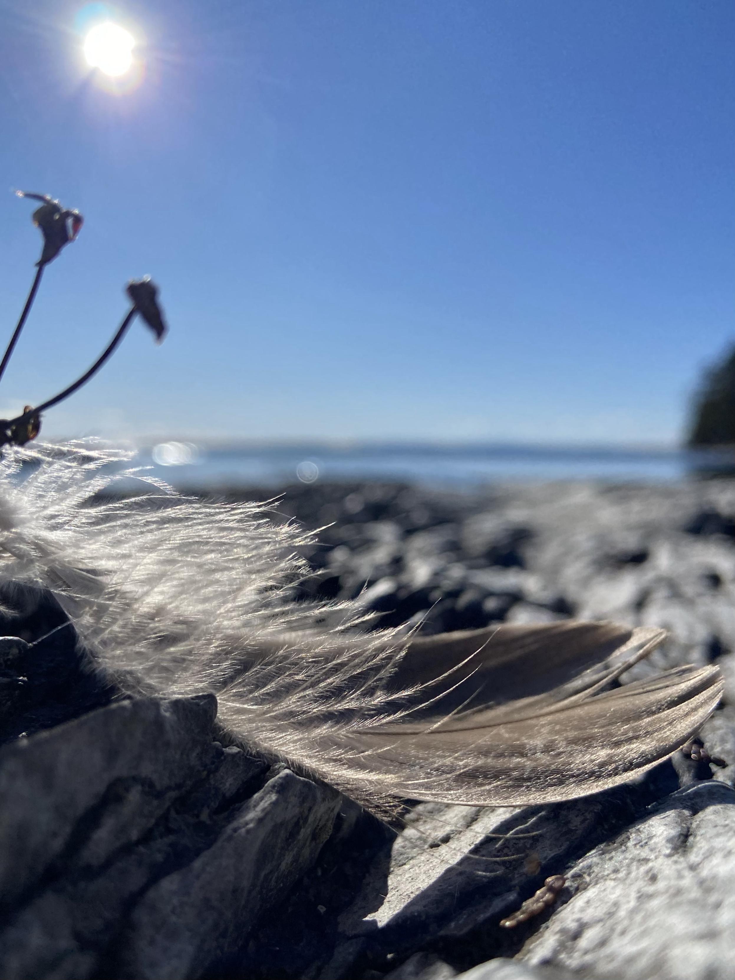 A gray bird feather sits concave side up on a rocky shore, under a blue sky with bright sun. The photo is taken from ground level, and we see a tiny strip of lake on the horizon, a different blue than the sky.