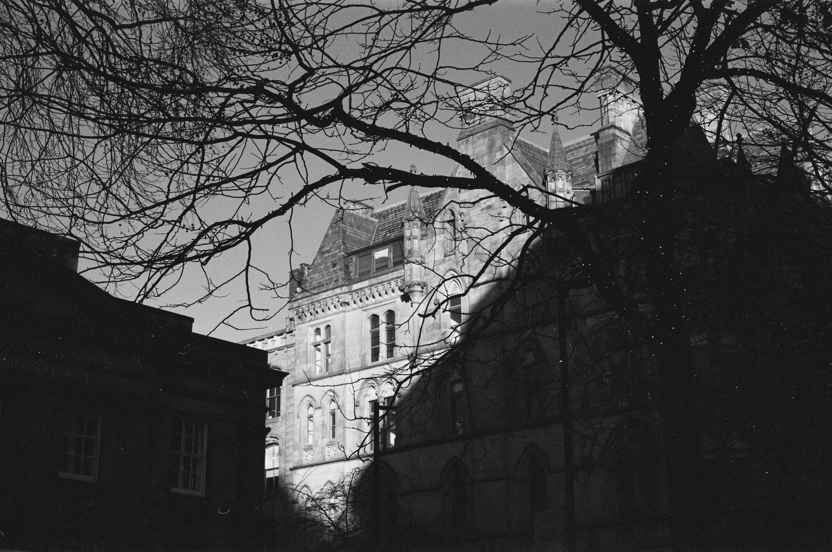A tall and old building is half in shadow. In front of it is a naked tree covered in fairy lights.
