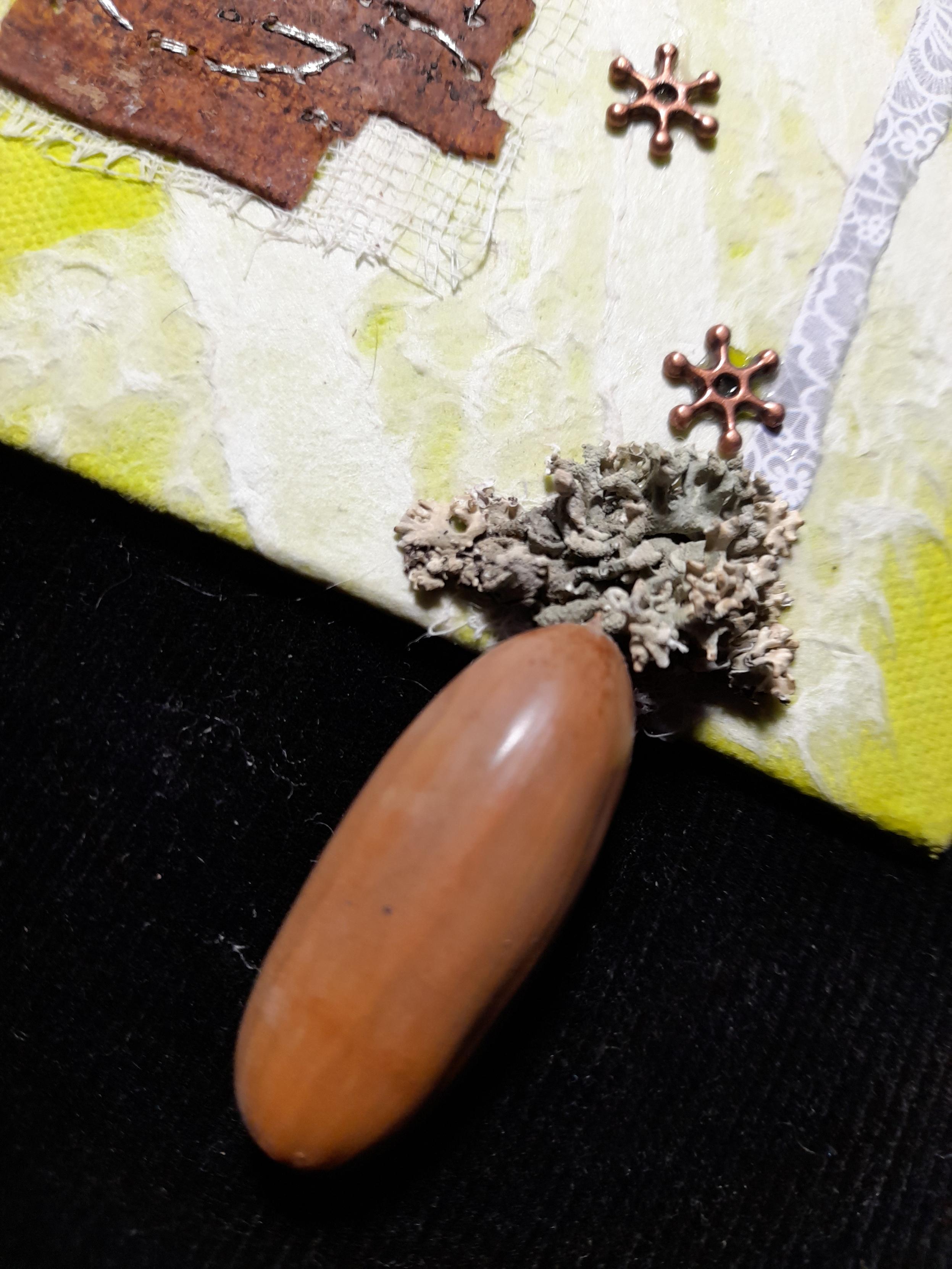 A long acorn mounted like a pendant under a real lichen. It comes from a nearly 200 yrs old oak.