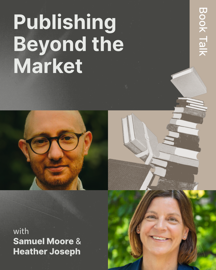 A promotional graphic titled βPublishing Beyond the Market.β The top half has a gray textured background with the event title in large white text and a vertical label reading βBook Talk.β To the right is an illustration of a tall, uneven stack of books. The bottom half shows two headshots: on the left, Samuel Moore; on the right, Heather Joseph. Text below reads βwith Samuel Moore & Heather Joseph.β