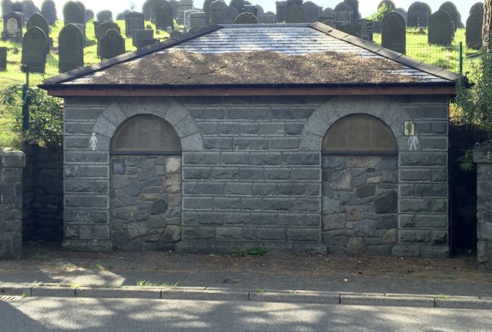 A small building with 2 doors that have been bricked up, and in the background you can see an old cemetery