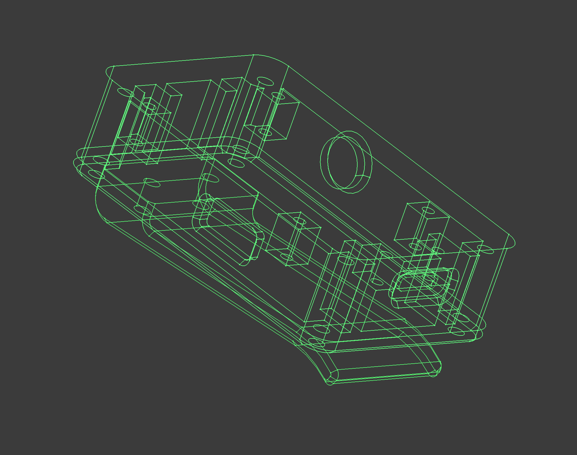 screenshot of freecad showing a box with built-in standoffs, holes for a charger and headphones and a belt clip in wireframe view