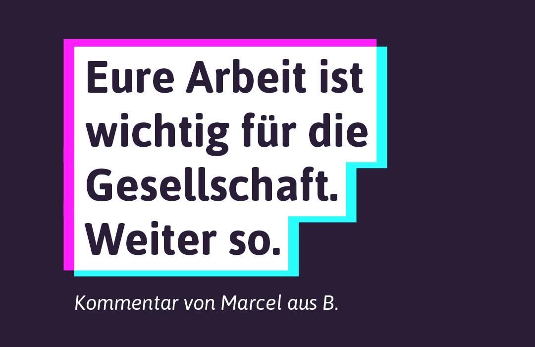 Texttafel: Eure Arbeit ist wichtig fΓΌr die Gesellschaft. Weiter so. Kommehtar von Marcel aus B.