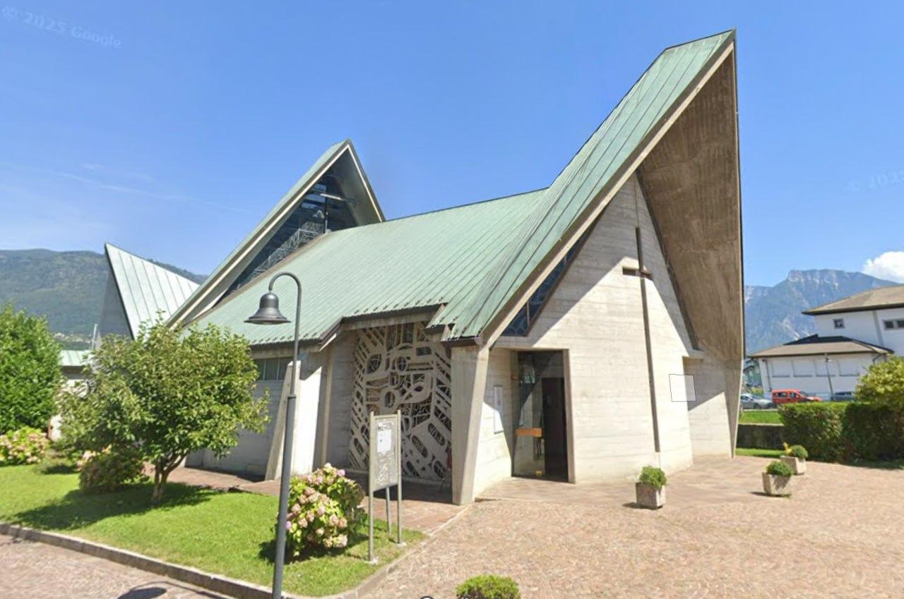 Chiesa della Beata Vergine del Rosario a Calceranica (TN) vista da fronte. Sembra graziosa finchΓ© non vedi il traffico che la circonda. Foto Google Maps.