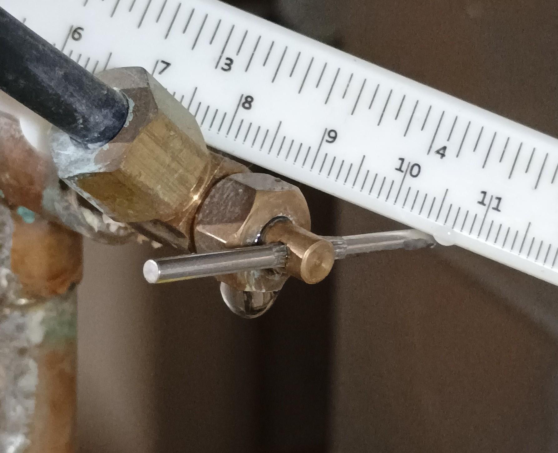 A needle valve tee-fitting with dripping water, and a scale behind it shows the problem