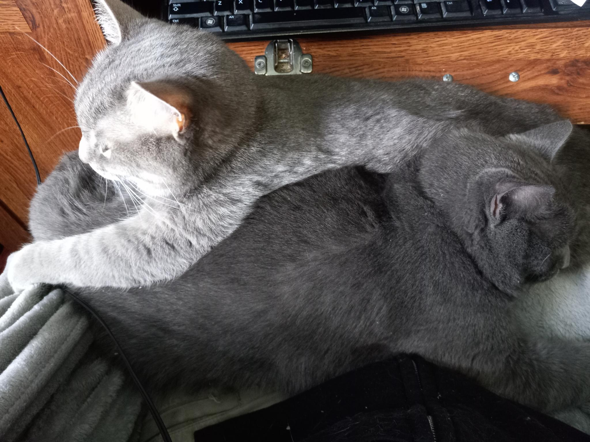 2 grey cats, one fully grey, one stripey, laying in opposite directions on a lap, with a keyboard tray in the background. The stripey cat is halfway draped over the larger grey cat.