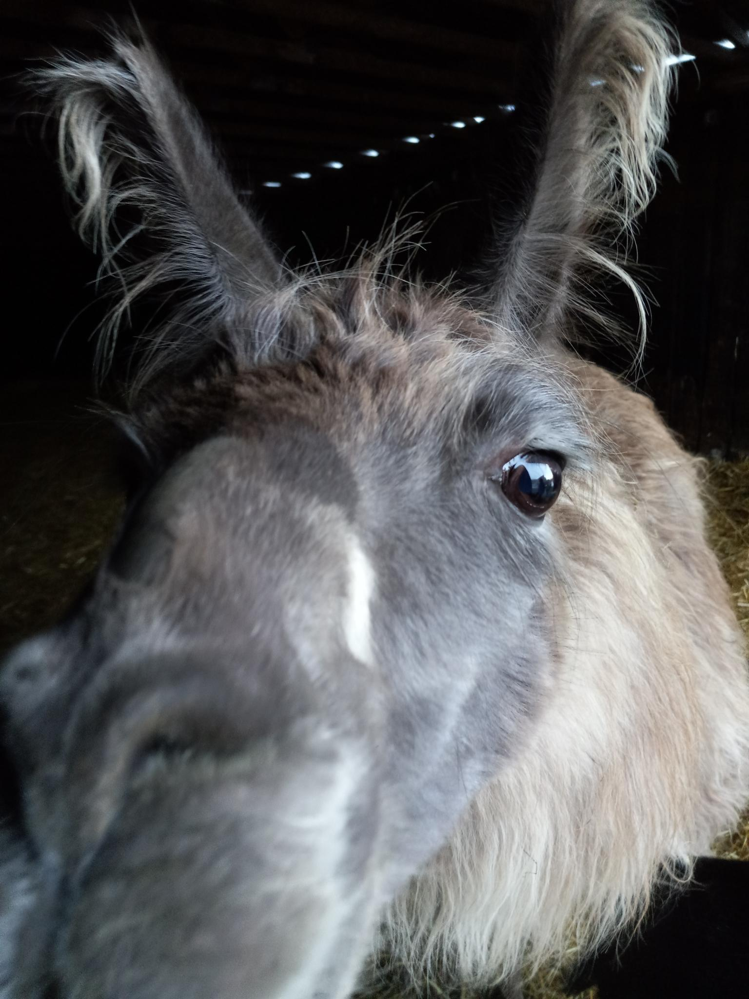 A giant brown fuzzy llama sticking his nose right into the camera, hoping for something edible