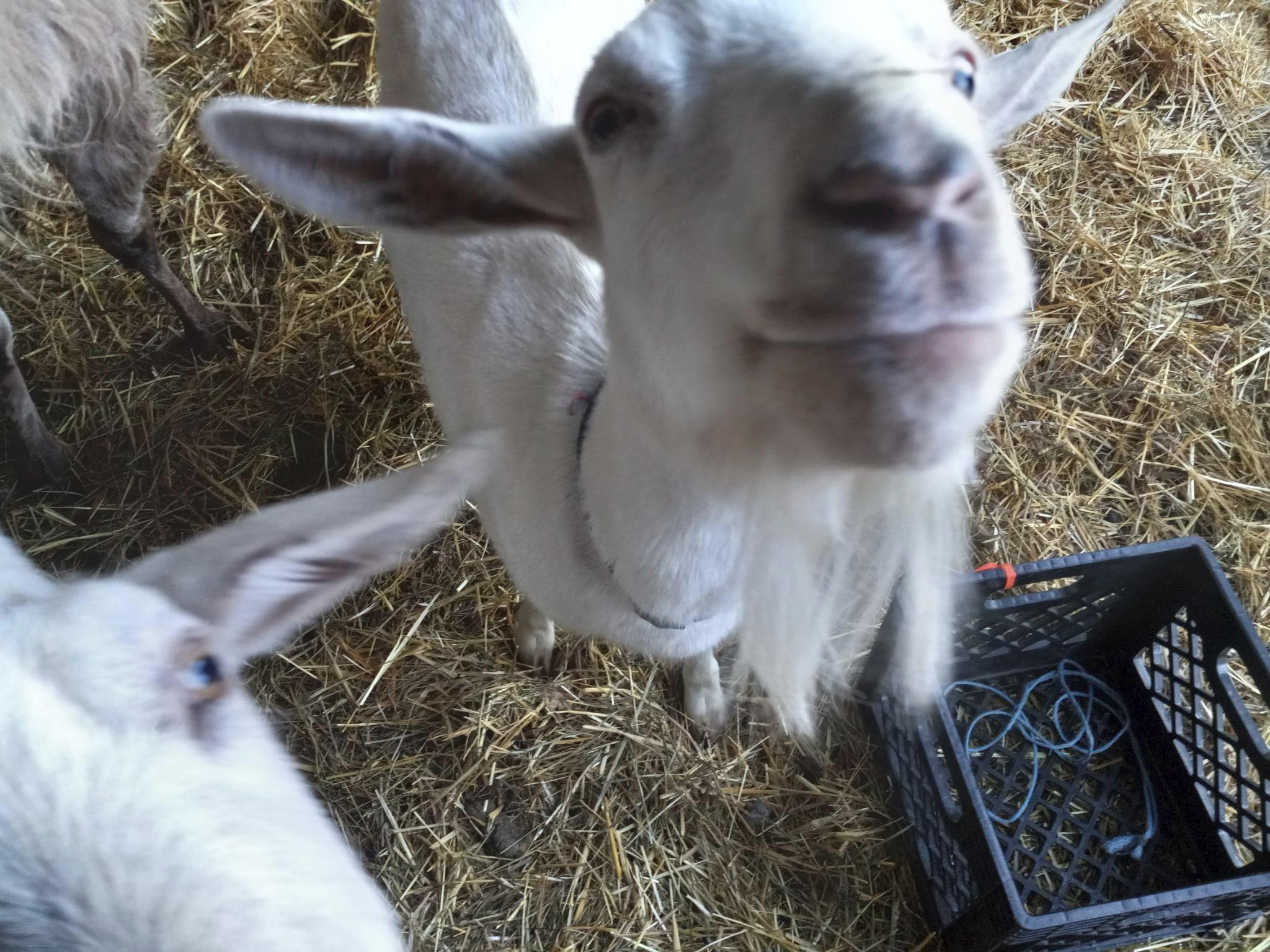A white goat sticking her nose right into the camera, again hoping for treats. Another white goat face is partially visible next to her, also looking for treats. The empty black milk crate sitting on the ground next to them strongly suggests they already ate all the treats.
