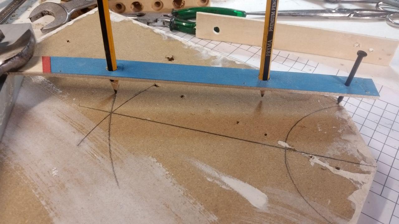 La striscia di legno con il chiodo posizionato sul punto in cui l'arco più interno tocca un lato. Non fate caso alla chiave da 26 mm a sinistra, mi è servita solo per evitare che il coso si ribaltasse facendo la foto. L'arco più interno serve per trovare sui due bordi due punti equidistanti dal vertice. La matita più lontana ha già tracciato un pezzetto di arco (non è una palma mal disegnata!). Lo stesso pezzetto di arco è stato fatto puntando il chiodo sull'altro bordo dell'angolo. Unendo l'intersezione tra i due pezzetti di arco (la cima della palma) con il vertice dell'angolo da dividere: la riga che si ottiene è la bisettrice, fidatevi. Ma ci vuole più tempo a spiegarlo che a farlo.