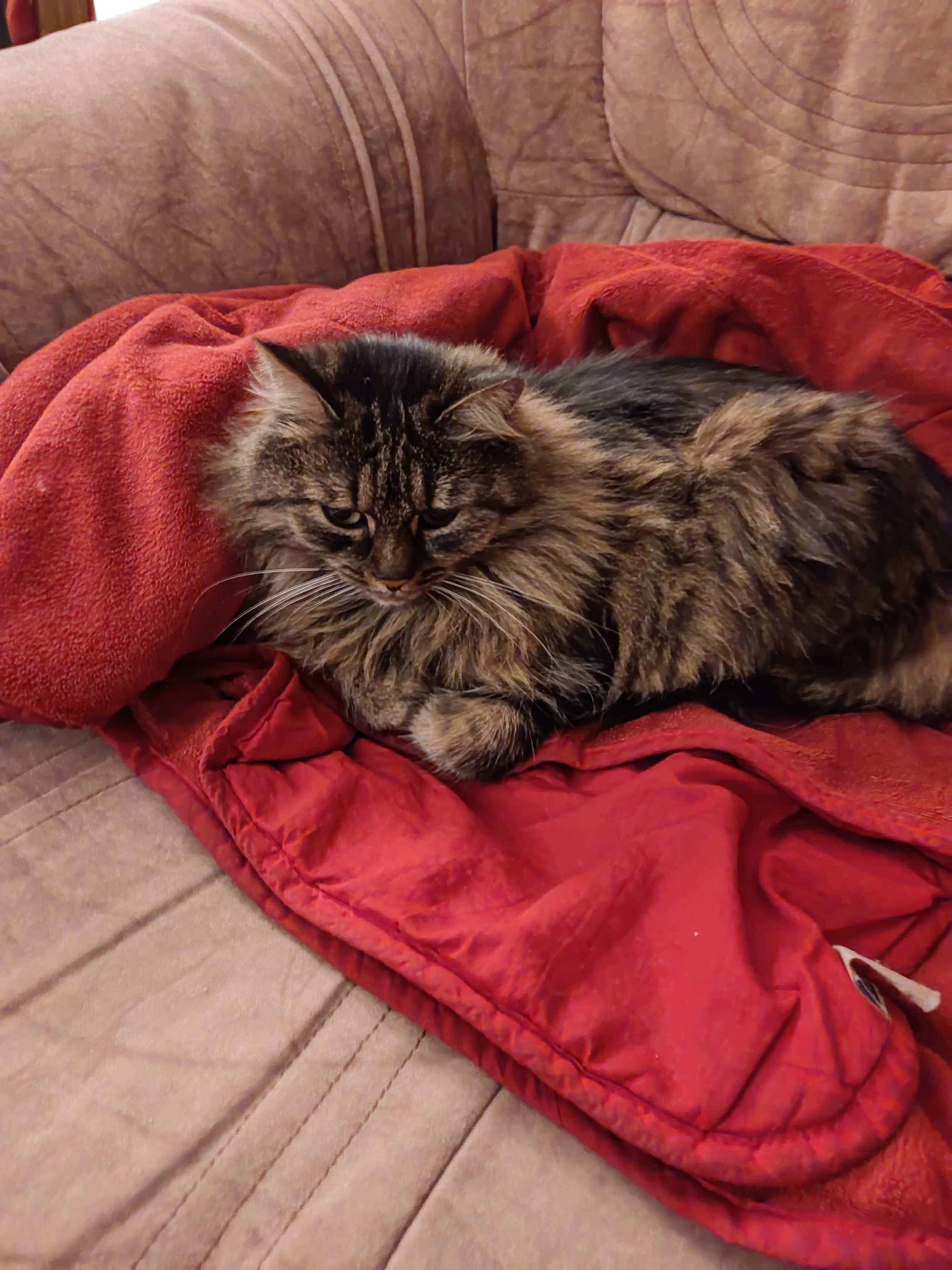 Gatta languidamente appoggiata in posa principesca su coperta rossa