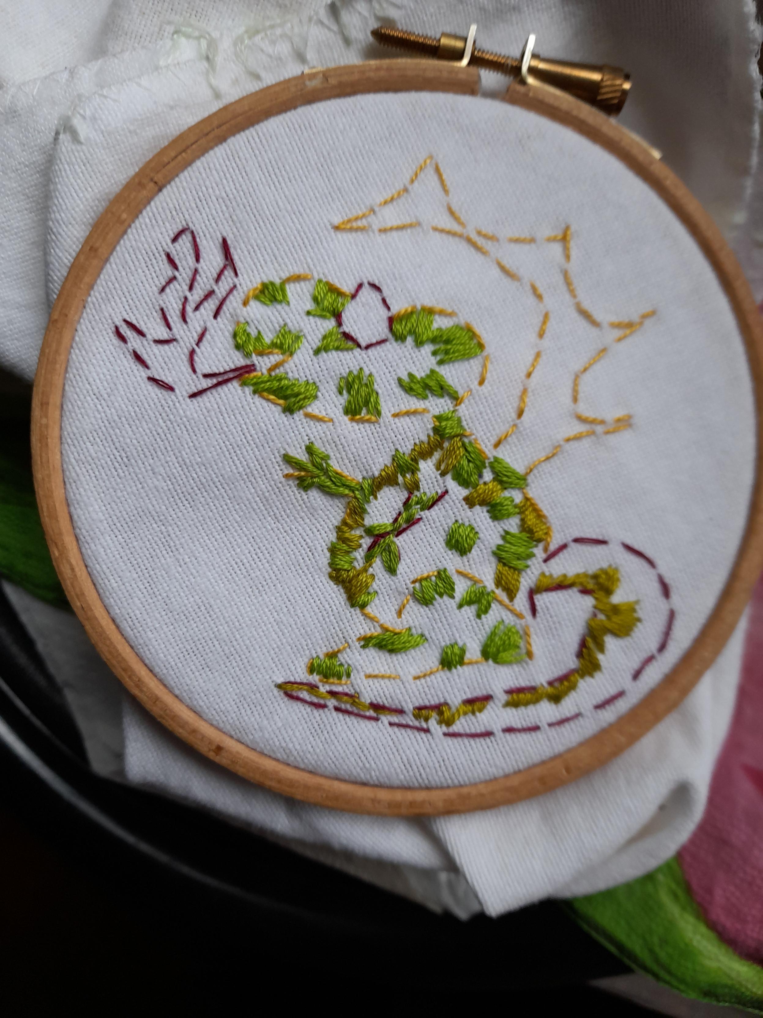 A later state of the embroidery in a round embroidery hoop. The outlines are stitched with simple running stitch in dark red and yellow. As I come from drawing, I fill the dragon like I would colour a sketch on paper. I started with a bright yellow green. To give the dragon skin some texture, I use the needle to paint spots in different directions with this green and then add other shades of green next to them.