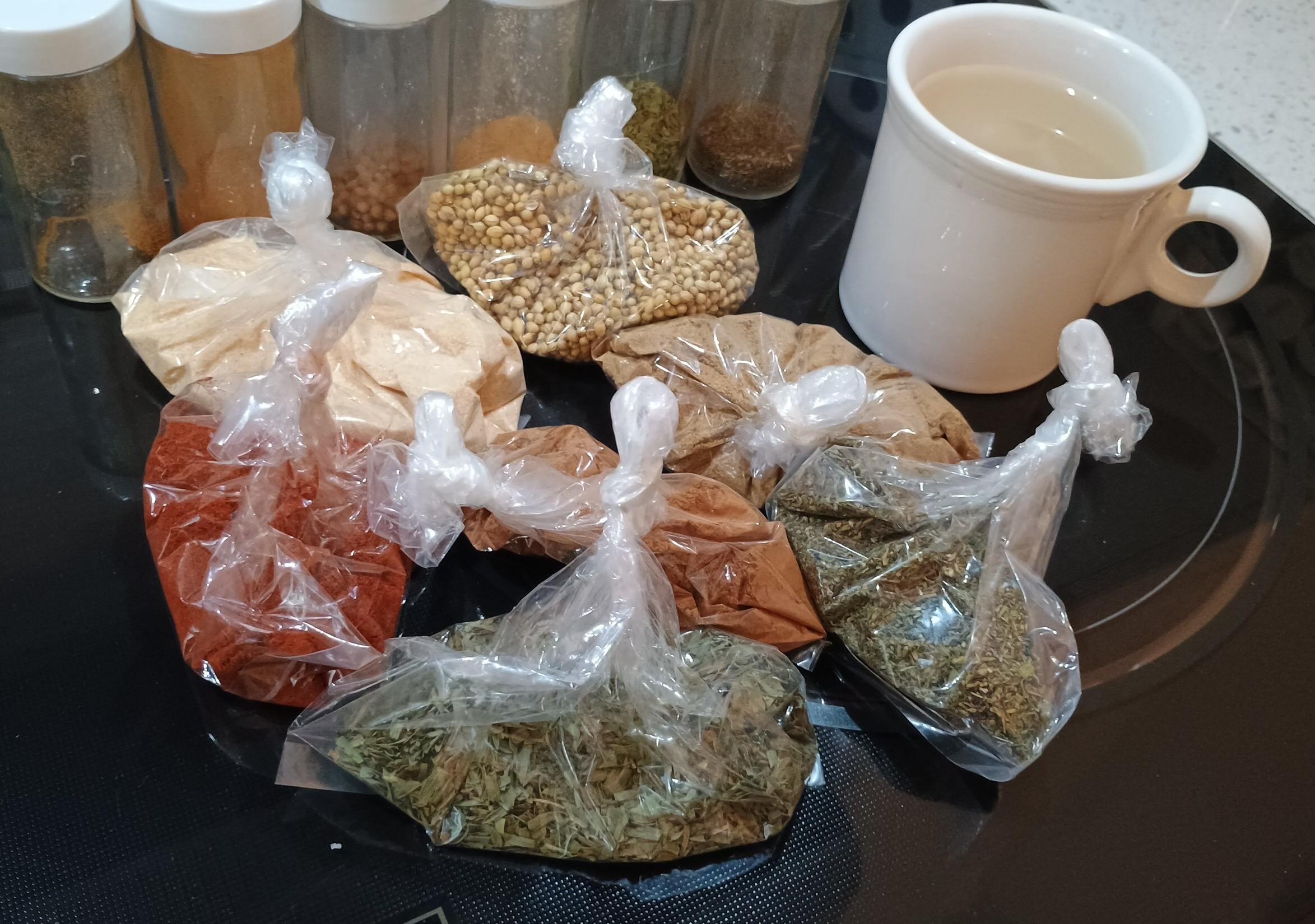 A bunch of transparent bags of the aforementioned spices, and a white mug beside them. A row of small jars is in the background and waiting to be filled.